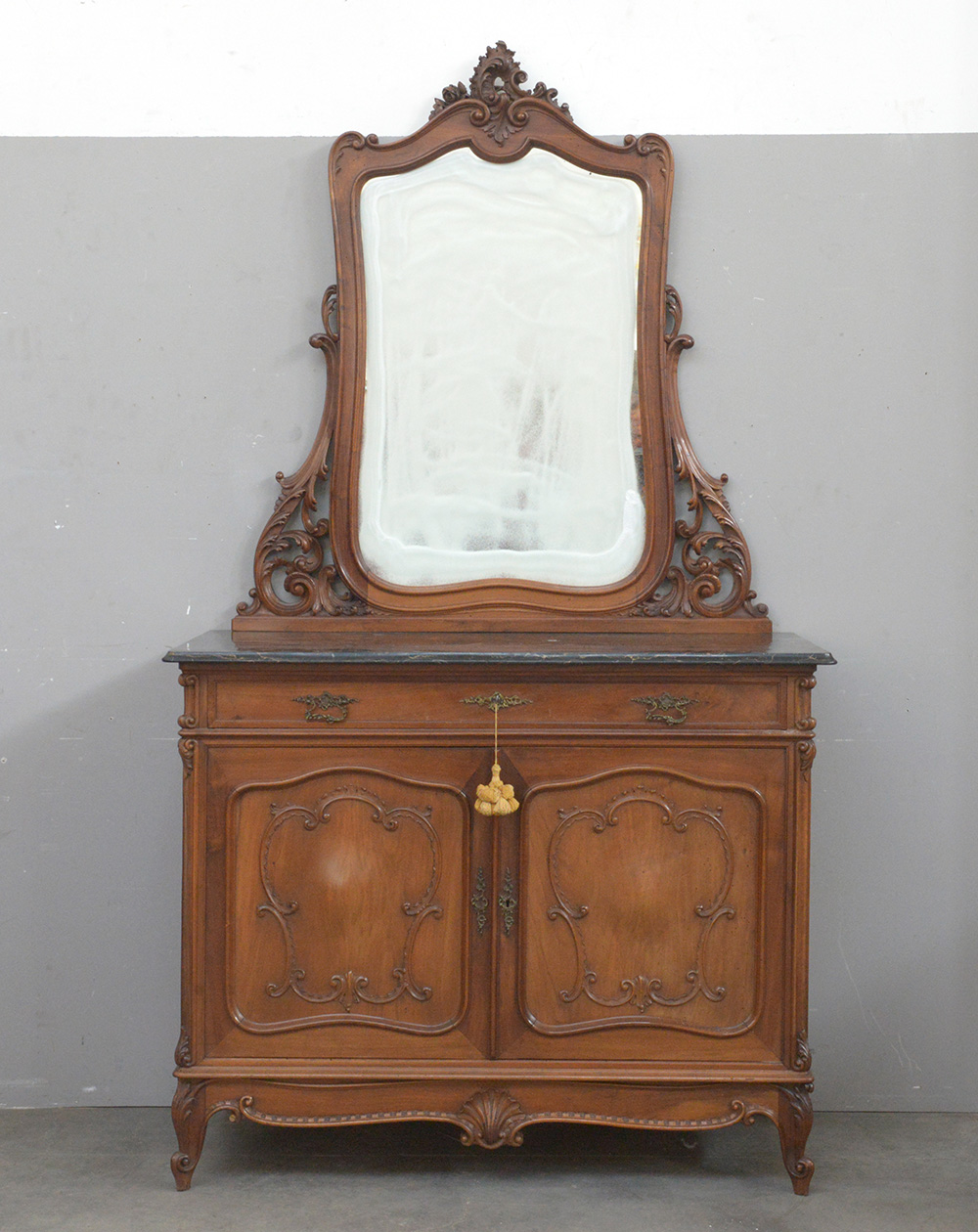 Comò ad un cassetto e due battenti celanti cassetti, specchiature incorniciate con intagli a volute. Piano in marmo nero sormontato da specchiera (cm 125x223x60) (difetti)
