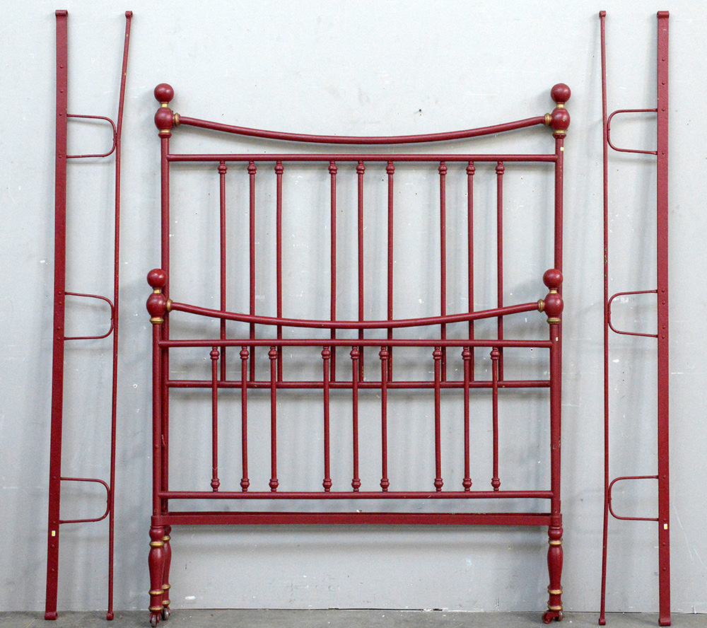 Letto ad una piazza e mezza in ferro battuto smaltato rosso, con testiera e pediera a ringhiera (difetti)