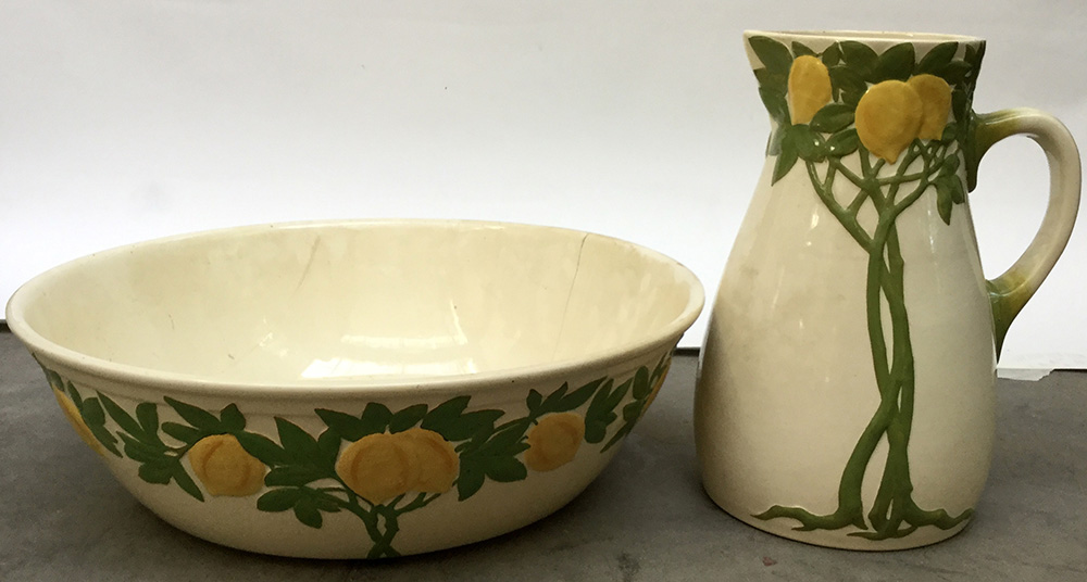 Manifattura Sarreguemines, catino con brocca per l'acqua in ceramica decorata con piante di limoni su fondo color crema (difetti)