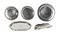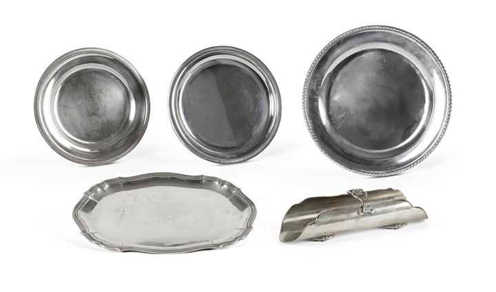 Lotto in argento composto da: quattro piatti, di cui tre di forma circolare ed un uno polilobato, ed un portagrissini