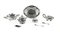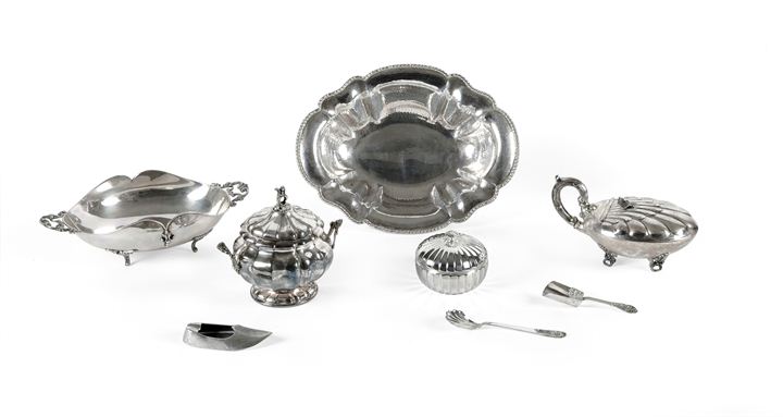 una formaggiera con cucchiaino; due zuccheriere di cui una con cucchiaino; un'alzata con piedini; un portacenere a forma di scarpa ed un centrotavola battuto a mano