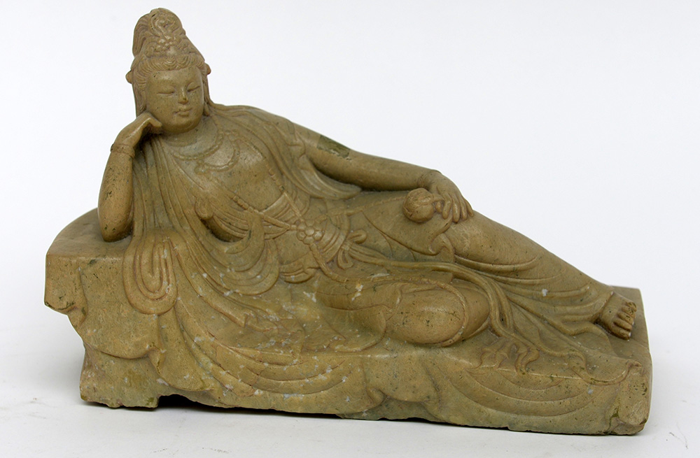 Scultura in pietra dura raffigurante Guanyin in posizione semi-sdraiata...