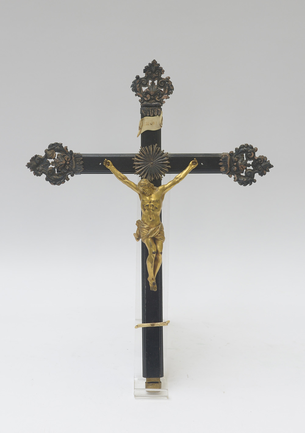 Arte del secolo XIX "Cristo crocifisso" scultura in bronzo dorato con cornice ebanizzata e puntali in argento (h cm 50)