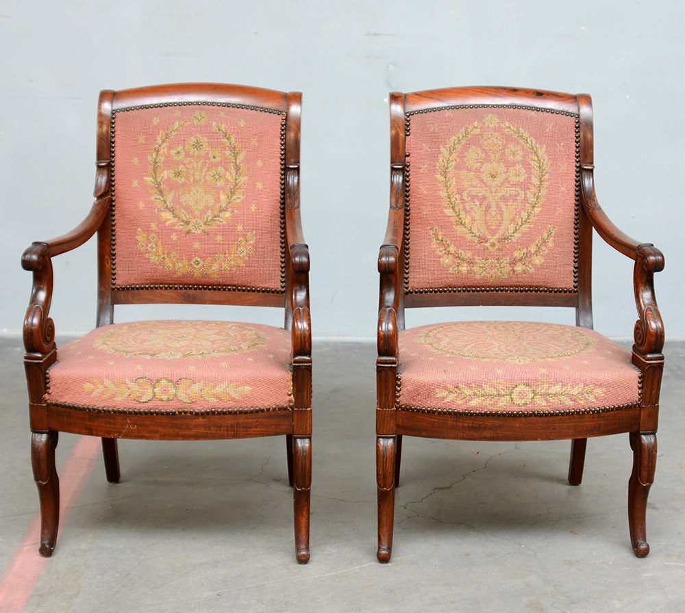 Coppia di poltrone con montanti e gambe anteriori sagomate e intagliate,...