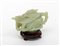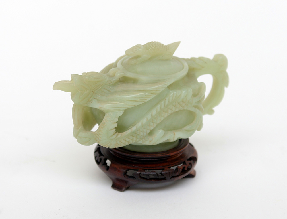 Piccola teiera in giada color celadon scopita a guisa di drago, con base in legno (difetti) Cina, sec. XX (h. cm 8)