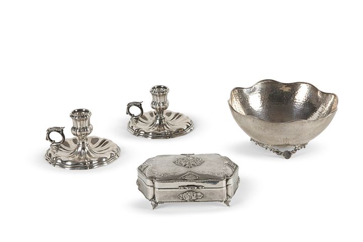 Lotto in argento composto da: una scatola portagioie; due bugie ed un'alzata battuta a mano, Cesa-Alessandria