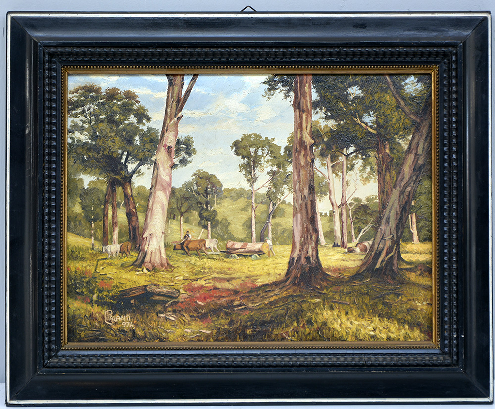 Palanti "Il taglio degli alberi" olio su tela (cm 30x40) firmato e datato 1974 in basso a sinistra, cornice ebanizzata (lievi difetti)