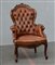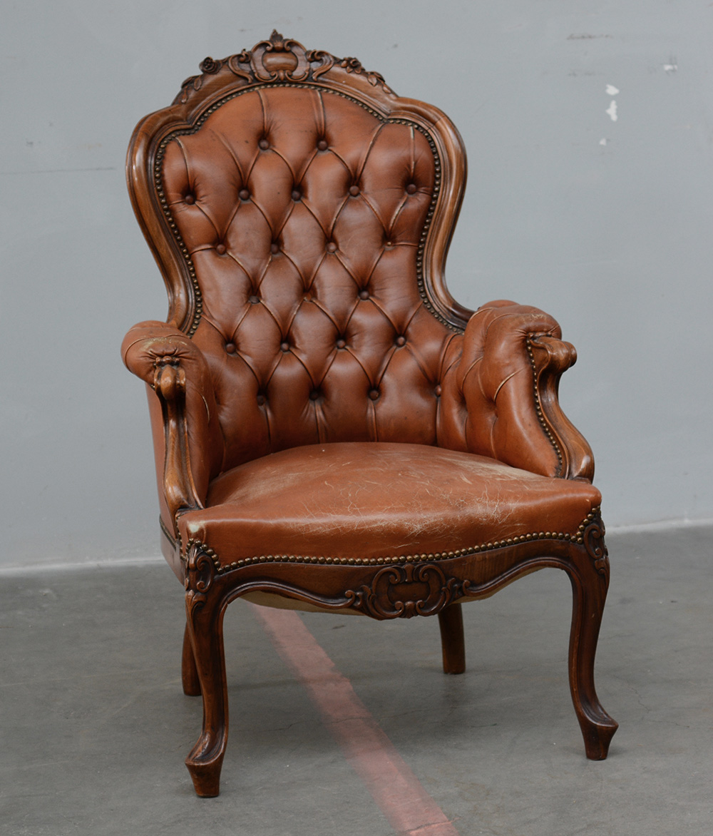 Poltrona di forma mossa con struttura in legno intagliato e imbottitura in pelle capitonné (difetti)