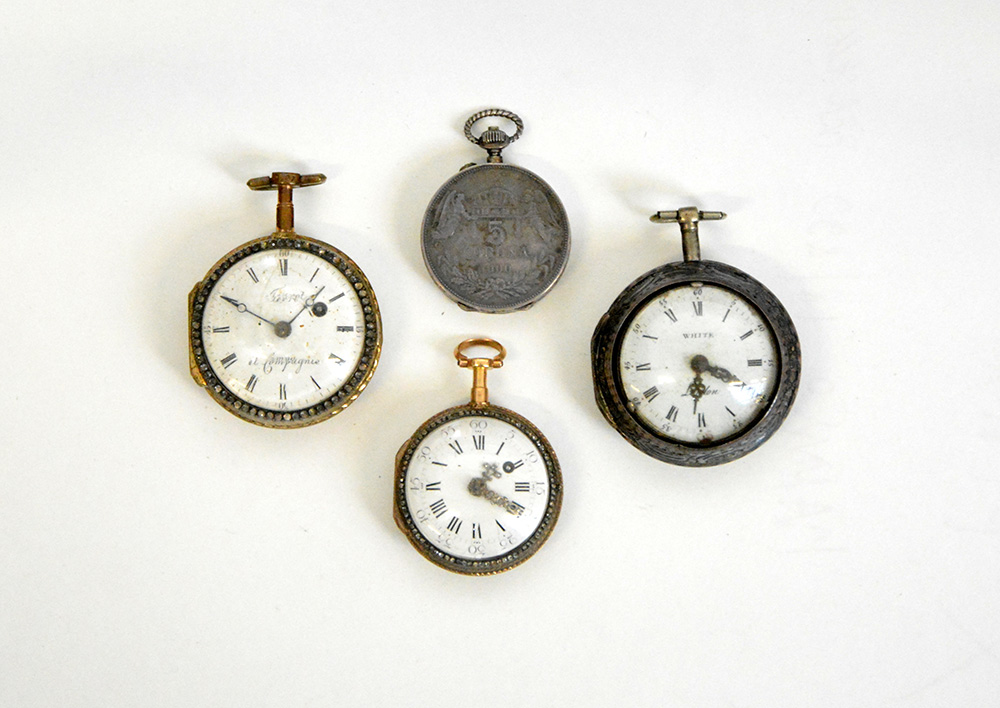 Lotto composto da quattro orologi da tasca in argento e meallo di diverse dimensioni e decori (difetti, mancanze)