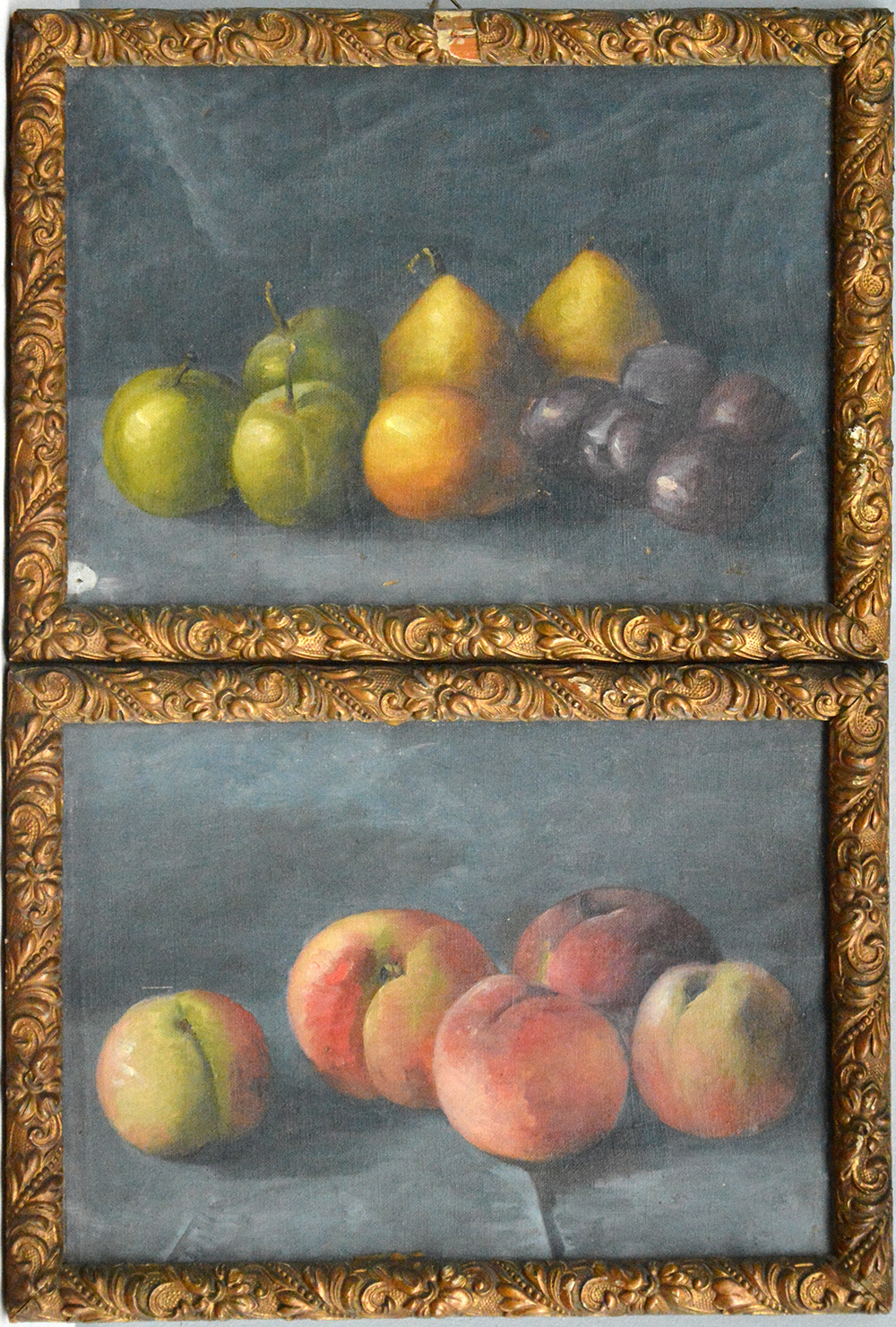 Ignoto, "Natura morta con frutta" coppia di dipinti ad olio su tela (cm 23x32), in cornici (difetti)