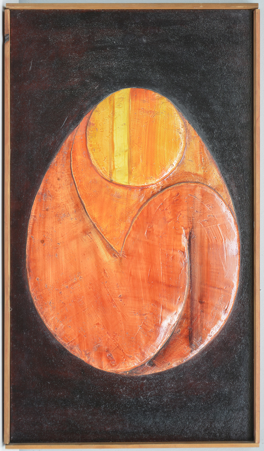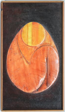 Claus Moller "Figura" bassorilievo in gesso dipinto in policromia applicato su pannello in truciolato (cm 75x42) firmato in basso a destra (lievi difetti)