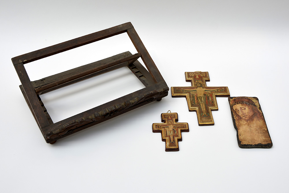 Lotto composto da un leggio in legno, due crocifissi in ceramica e una riproduzione del volto di Cristo su tavoletta (difetti)