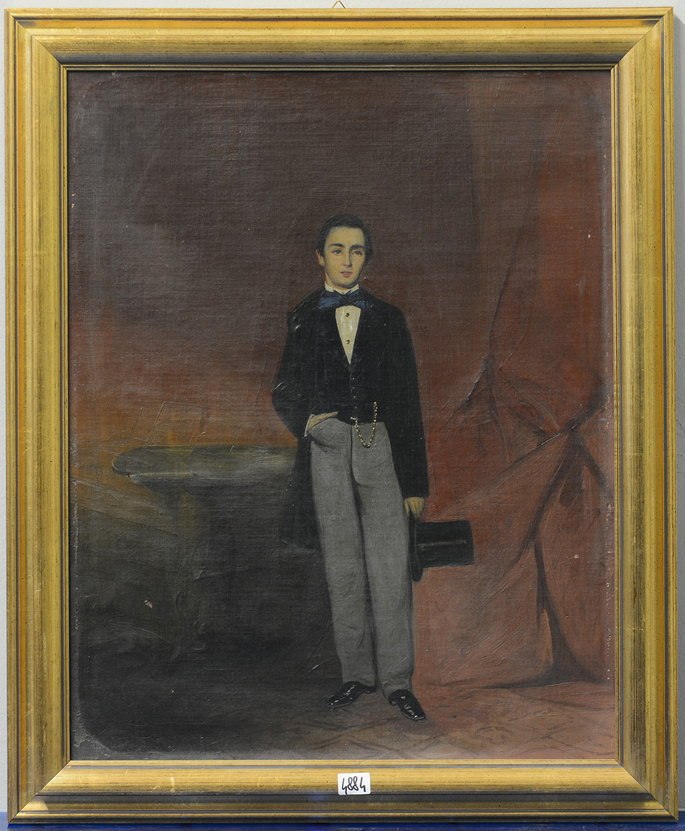 Ignoto, "Ritratto di ragazzo con tuba" olio su tela (cm 60x47,5) in cornice (difetti)