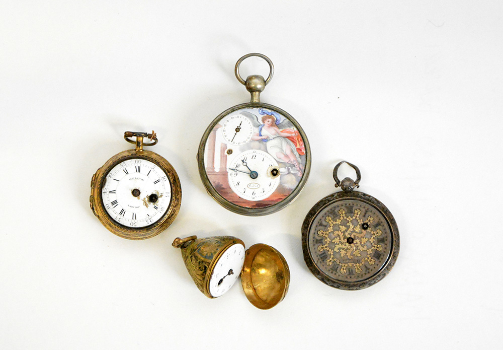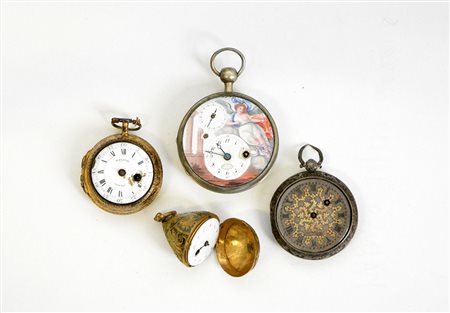 Lotto composto da quattro orologi da tasca di diversi dimensioni, materiali e decori (difetti, mancanze)