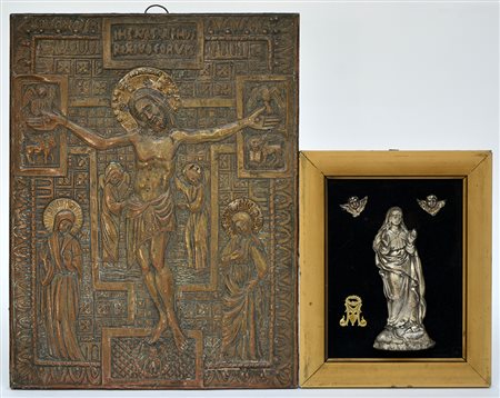 Lotto composto da un'icona in rame sbalzato (cm 30x39) e una placca devozionale con l'Immacolata, in cornice (difetti)