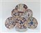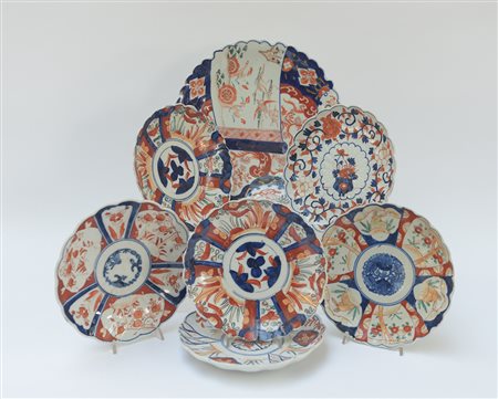 Sette piatti in porcellana a decoro Imari di cui uno da portata, con sostegni (dieftti) Giappone, sec. XX (d. 30 cm.)