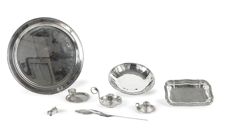 due ciotole, un portauovo, due portacandele, una spiga ed una ranocchia rivestita d'argento