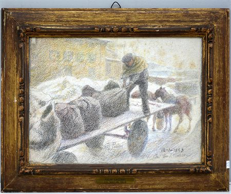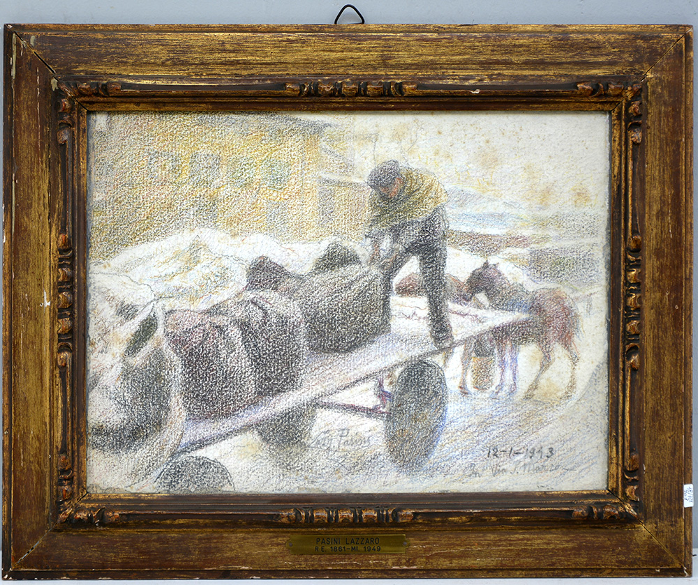 Lazzaro Pasini (Reggio Emilia 1861 - Milano 1949) "Sul Naviglio in via S. Marco" pastelli colorati su cartoncino (cm 29x39) firmato in basso al centro, titolato e datato 1943 a destra, in cornice (difetti)