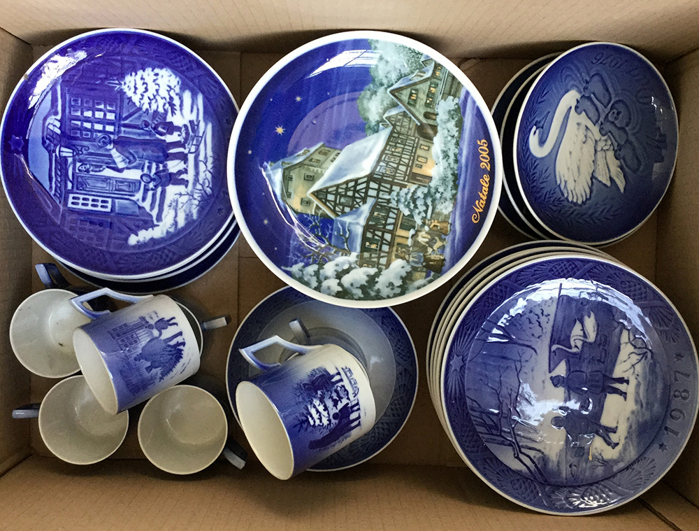 Manifattura di Copenhagen, lotto composto da numerosi piattini in ceramica a decoro blu e sette tazze con relativi piattini (lievi difetti)