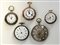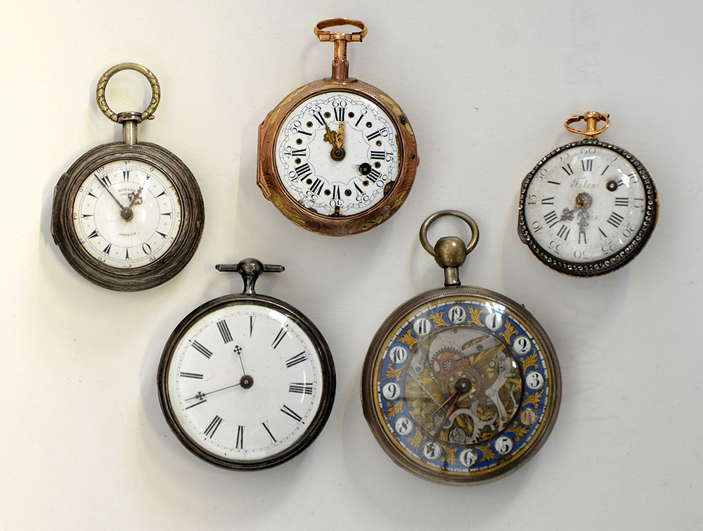 Lotto composto da cinque orologi da tasca in argento, oro 18K e metallo di diverse dimensioni e decori (difetti, mancanze)