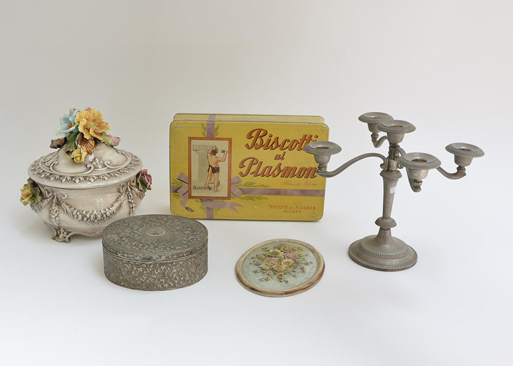 Lotto vario composto da un candelabro e un cofanetto in metallo, una scatola serigrafata, una biscottiera in ceramica di Bassano e una placca ovale in maiolica con decoro floreale in rilievo (difetti)