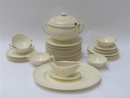 Manifattura di Wedgwood, parte di servizio da tavola modello "Etruria" composto da diciassette piatti piani, quattro fondi, cinque piattini da frutta, cinque tazze da consommé con sei piattini, salsiera e una zuppiera (lievi difetti)