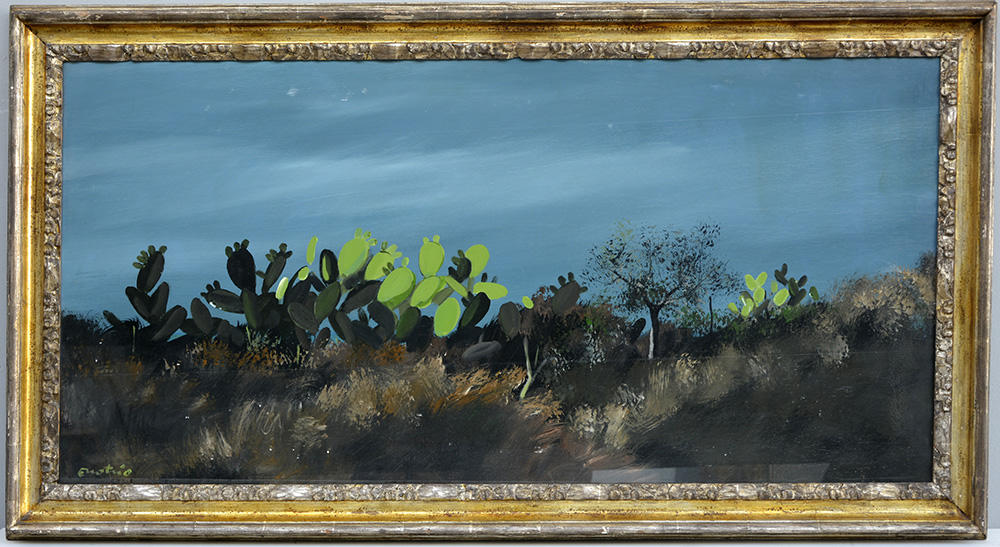 Enotrio Pugliese (Buenos Aires 1920 - Pizzo Calabro 1989) "Fichi d'India sul Tirreno" olio su compensato (cm 60x120) firmato in basso a sinistra. Al retro: firmato e titolato. In cornice