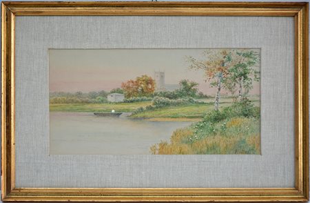 Firma indecifrata, "Scorcio di lago" tecnica mista su cartoncino (cm 20x39)...