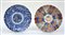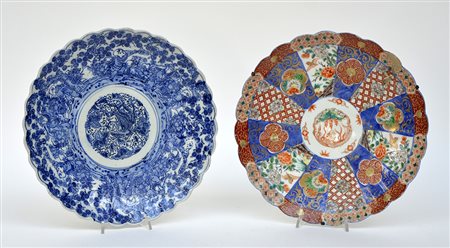 Due piatti in porcellana a decoro in stile Imari e bianco e blu (restauri)...
