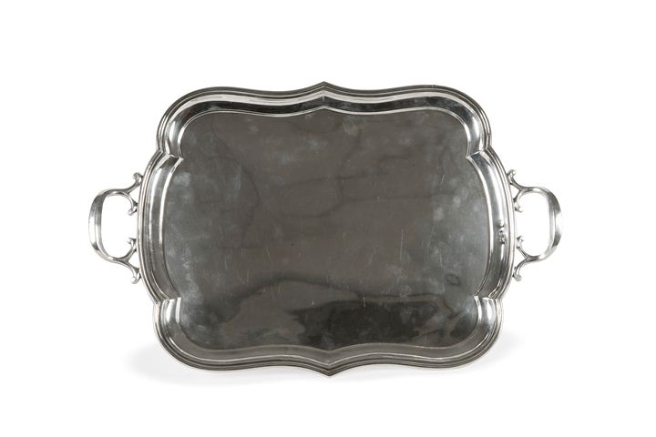 VASSOIO IN ARGENTO Vassoio di forma polilobata a doppia molatura con manici,...