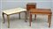 Lotto composto da un tavolino da salotto con piano in onice di forma mossa, un tavolino e un mobiletto da lavoro con piano apribile, entrambi decorati con filettature e piccoli intarsi. Misure differenti (difetti)