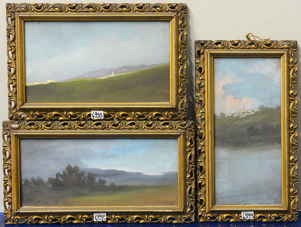 Firma indecifrata, gruppo di tre tempere su cartone raffiguranti paesaggi (d...