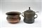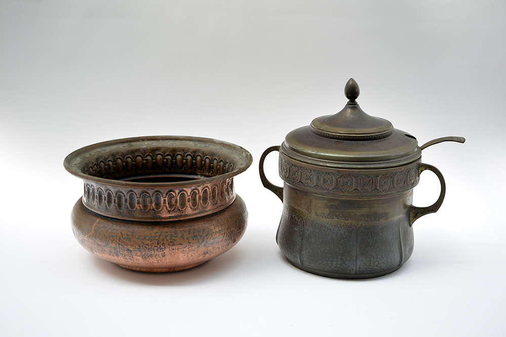 Lotto composto da un cachepot in rame sbalzato e un contenitore biansato con coperchio e mestolo (difetti)