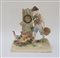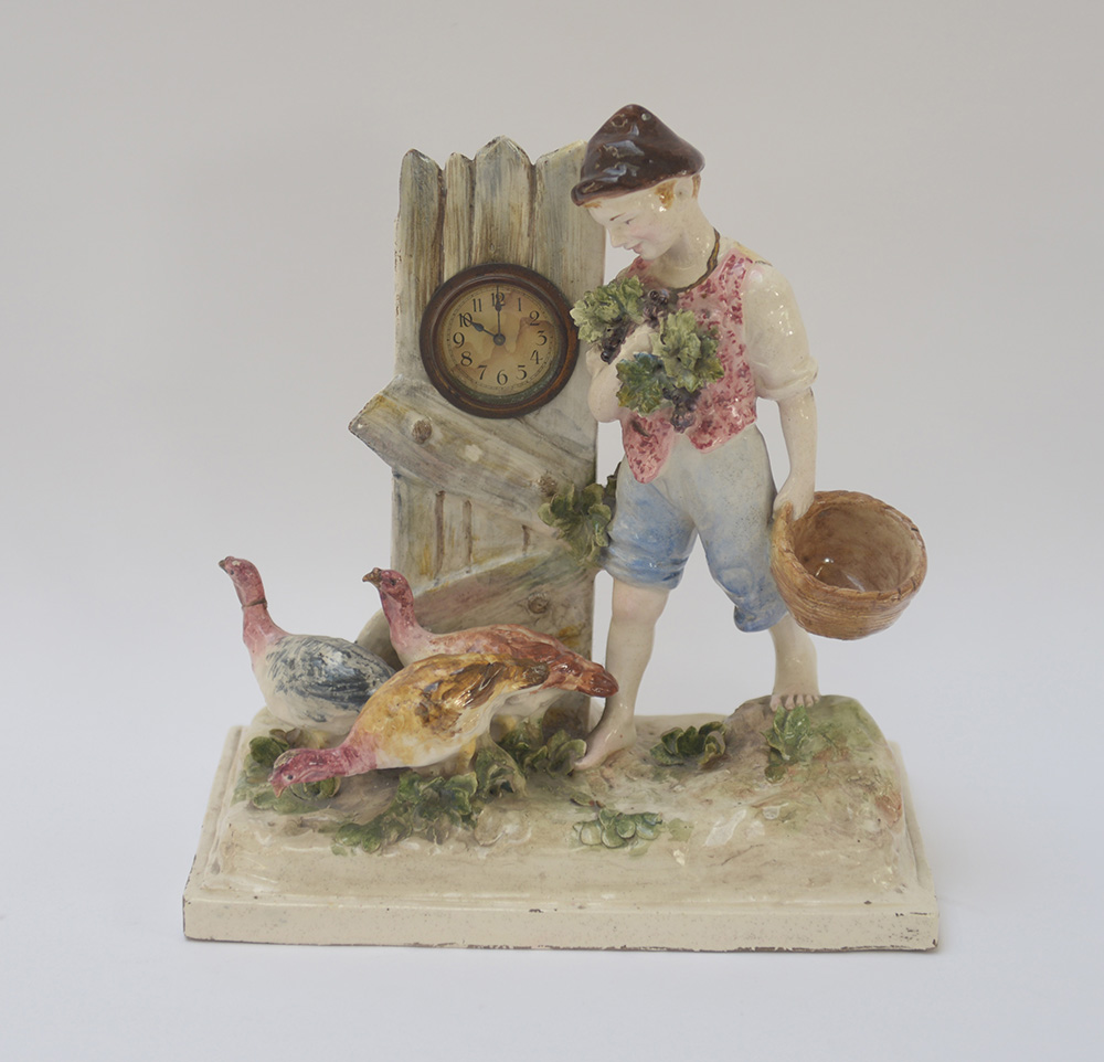 Gruppo in ceramica policroma raffigurante un ragazzo con tacchini davanti a una staccionata nella quale è inserito un piccolo orologio (h cm 30) (difetti e restauri)