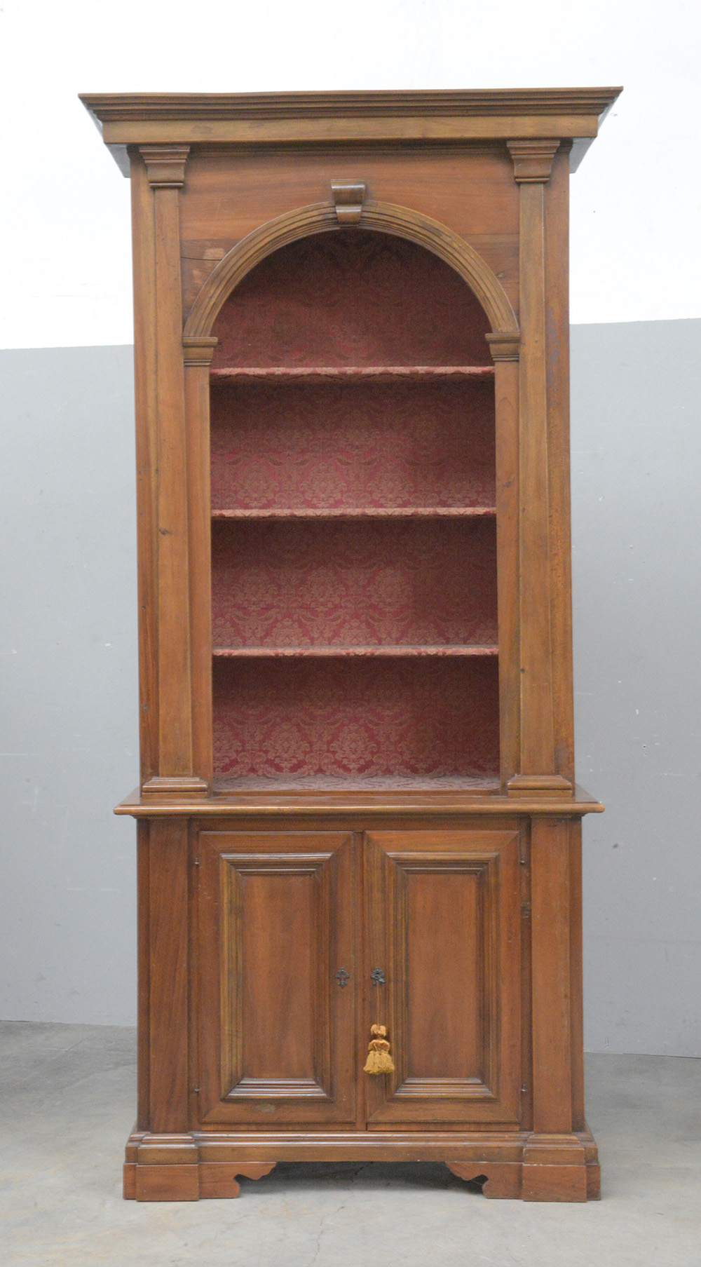 Mobile a due corpi in noce con parte inferiore a due battenti e piedi a mensola, parte superiore a giorno a quattro ripiani (cm 105x237x45) (difetti)