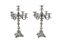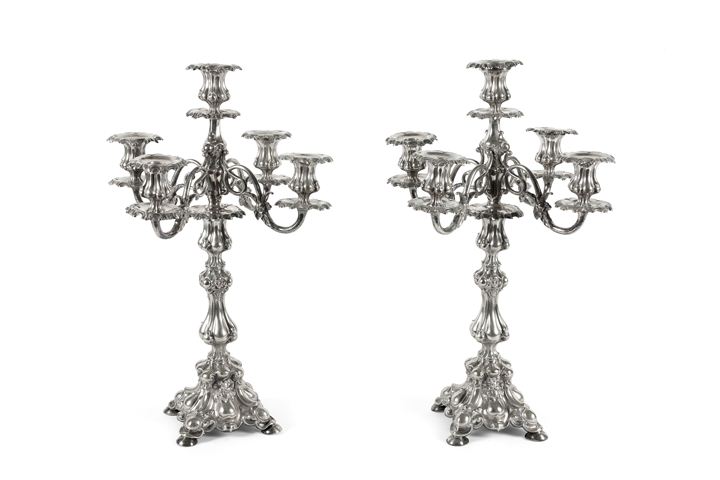 Coppia di candelieri a cinque luci in sheffield riccamente sbalzati. Epoca, inizio XX secolo