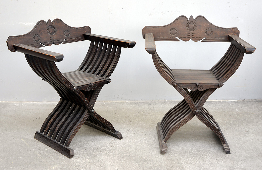 Coppia di sedie del tipo ''Savonarola'' in legno dolce (difetti)