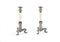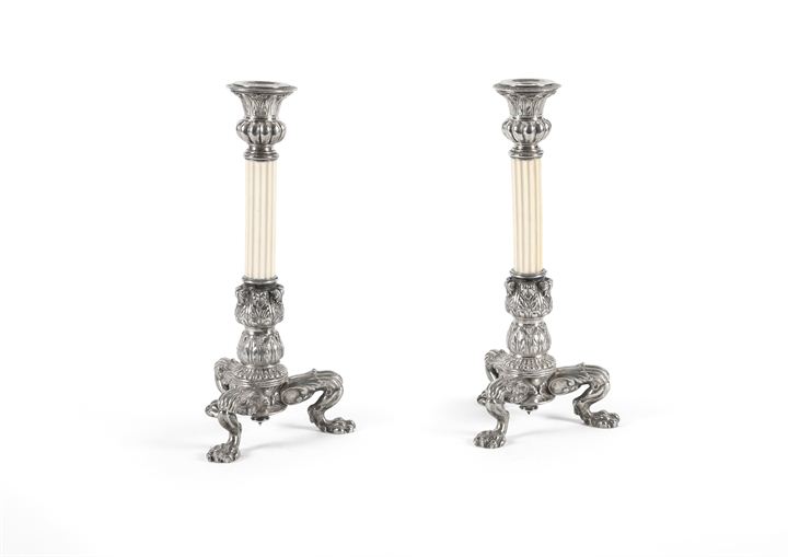 Coppia di candelieri in argento 925 millesimi ed avorio di gusto neoclassico, finemente cesellati