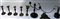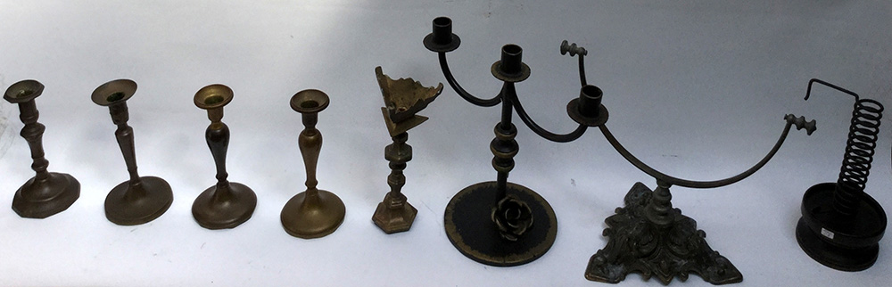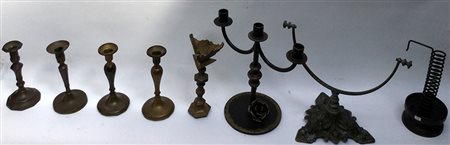 Lotto composto da sette candelieri in bronzo e una base per specchio (difetti)