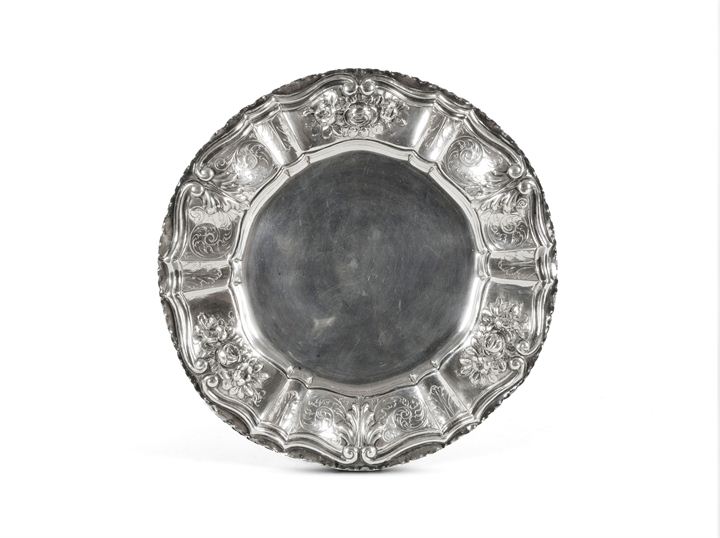 Piatto in argento sbalzato e cesellato a motivi vegetali, fine XIX secolo,