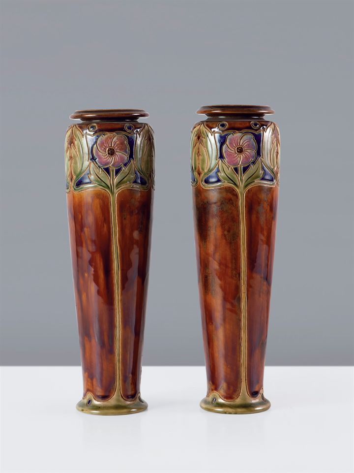 ROYAL DOULTON ENGLAND Coppia di vasi invetriati, epoca Liberty, firmati "...
