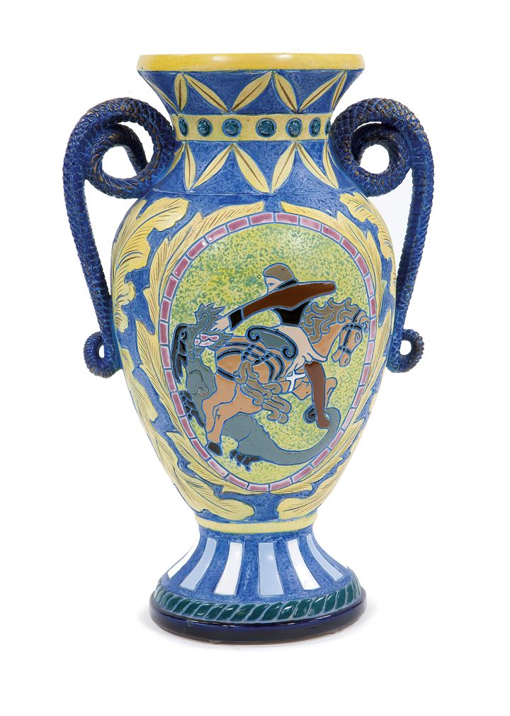 decoro stilizzato con San Giorgio che uccide il drago; al verso il Grifone con motivi arabescati ed ogivali. Due anse applicate raffiguranti serpenti attorcigliati. Firma stampigliata "Amphora made in Cecho-Slovacchia" n. 25 - 15468, epoca 1925