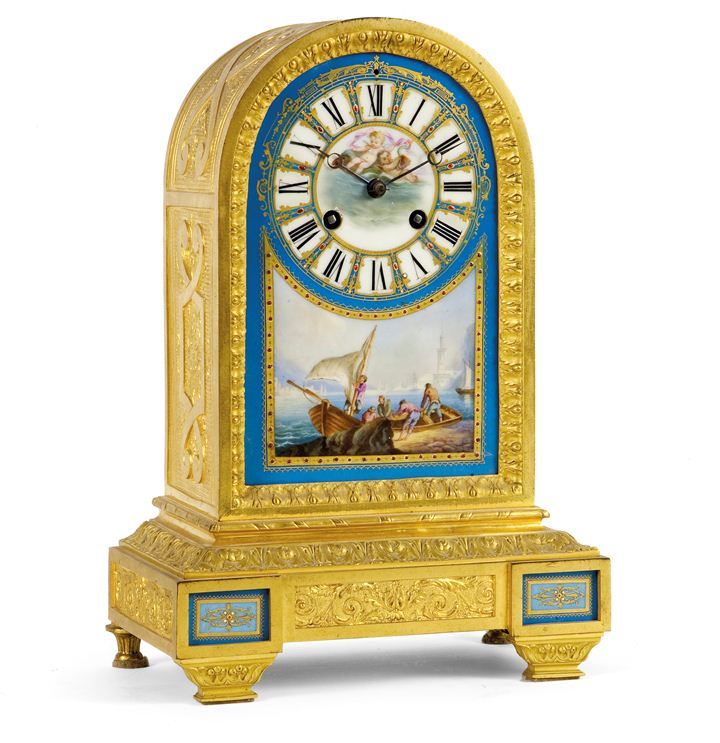 Pendola da tavolo, epoca seconda metà XIX secolo, in bronzo cesellato e dorato in oro zecchino;corpo centrale con inserti in porcellana di Sèvres, dipinti con scene di pesca; quadrante con numeri romani.