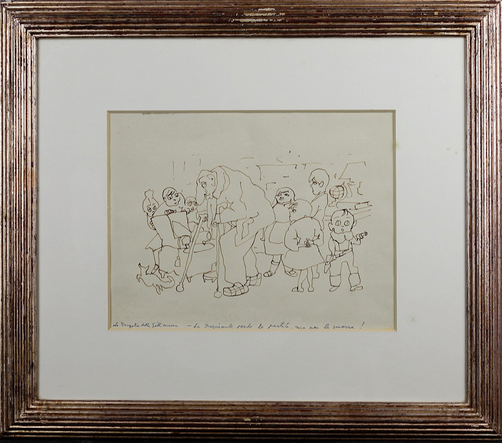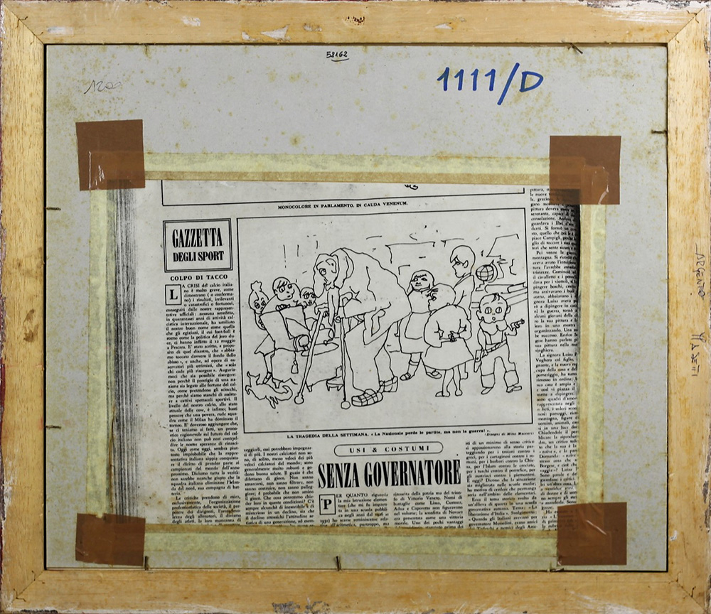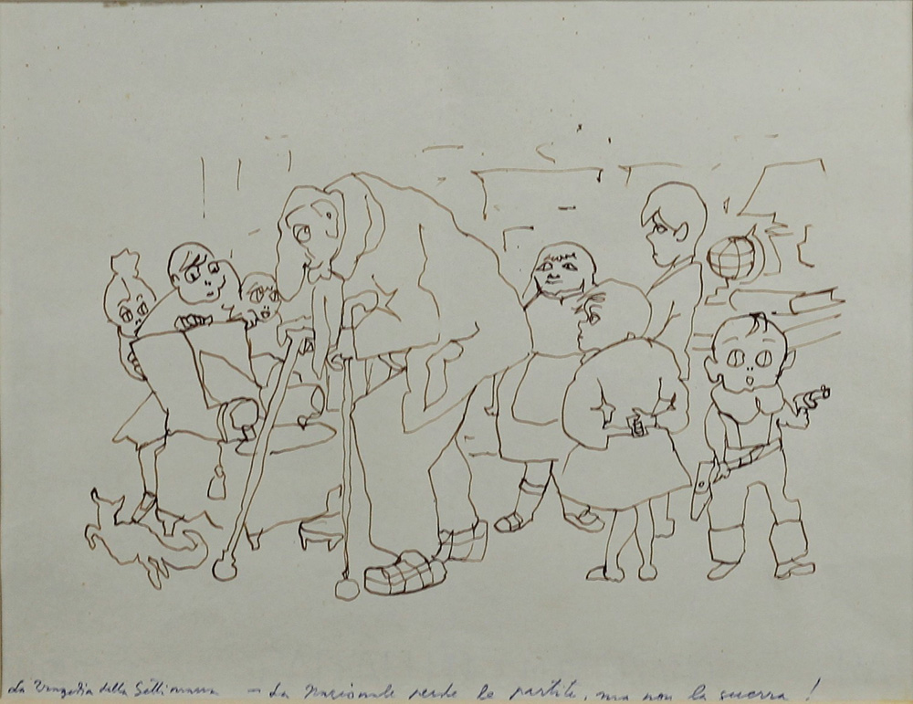 MACCARI MINO (SIENA 1898 ROMA 1989), La Nazionale perde la partita...., Disegno Anno 1957 Dim. 23x30 Autentica su foto dell'Artista Archiviata presso l'Archivio del Maestro Mino Maccari al numero 2866 in data 12/08/2001 Pubblicato su il "Mondo" del 4 giugno. La battuta è di pugno di Maccari non firmato. Al verso ritaglio giornale Titolo e battuta del Maestro in basso