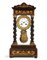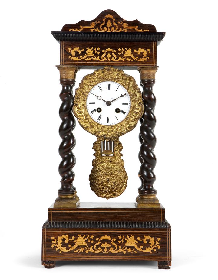 Cassa in legno intarsiato e bronzetti dorati, quadrante in smalto con numerazione romana, movimento firmato Japy Frères con suoneria delle ore e delle mezze ore su campanello. Completo di chiave di carica e pendolo.