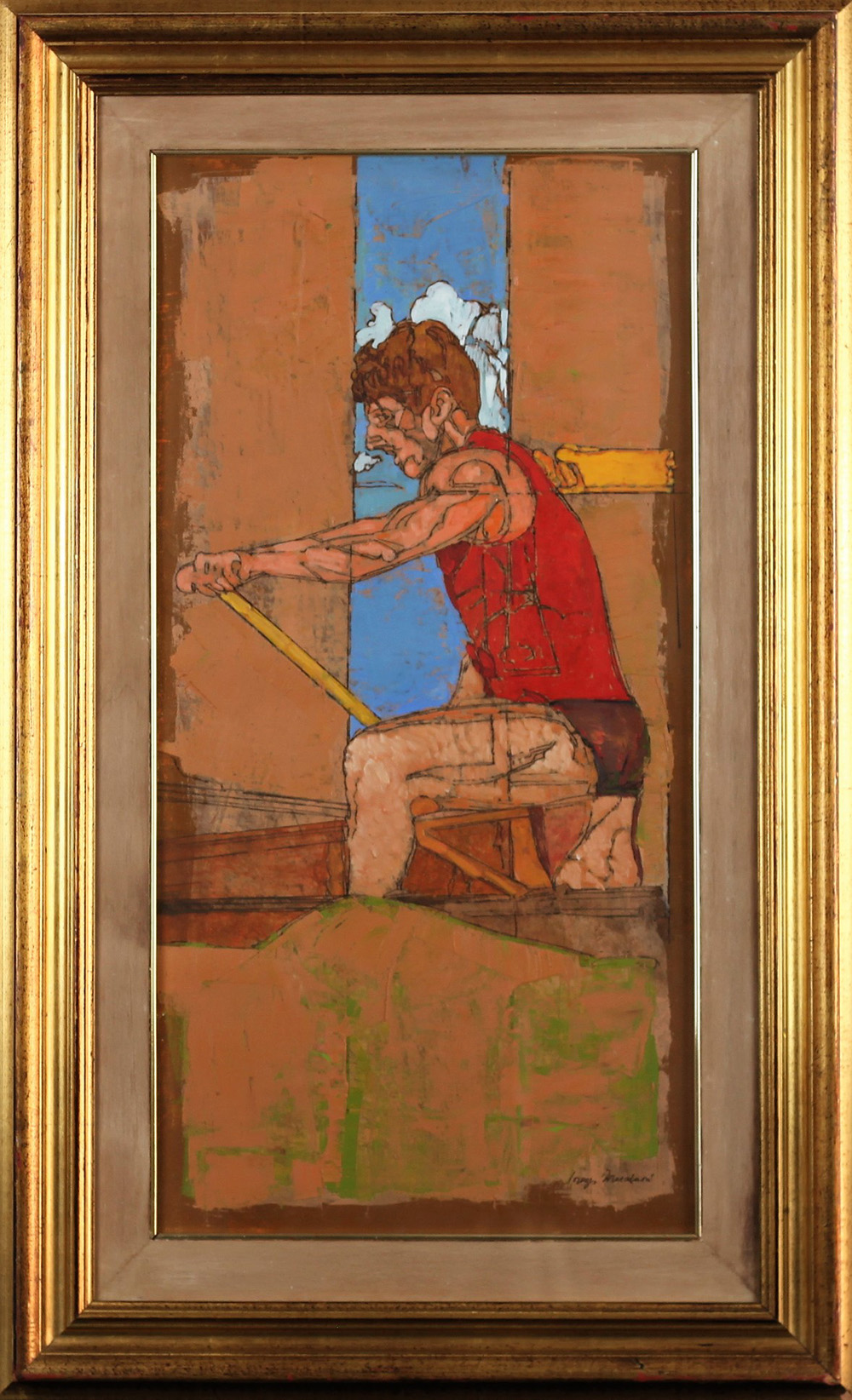 TORNABUONI LORENZO (ROMA 1934 ROMA 2004), Canoista, Olio su tavola Dim. 60x30 Firmato in basso a dx
