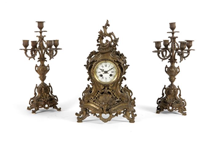 TRITTICO DI OROLOGIO E CANDELIERI Trittico composto da orologio e coppia di...