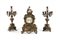 Trittico composto da orologio e coppia di candelieri a cinque luci, in bronzo brunito, di gusto baroccheggiante