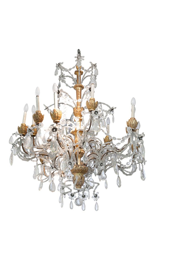 Lotto 518 | LAMPADARIO Grande lampadario a dodici luci, fusto in legno dorato, riccamente...
