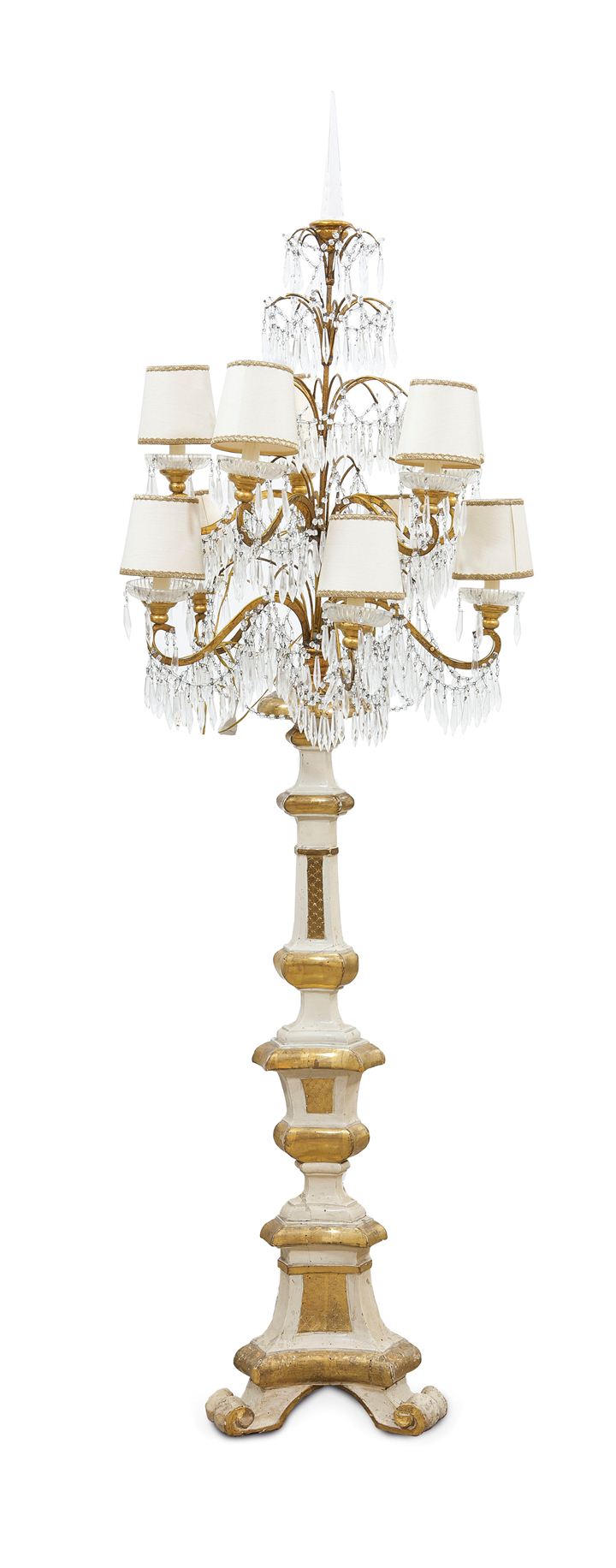 CANDELABRO Candelabro in legno laccato e dorato sormontato da lampada in...